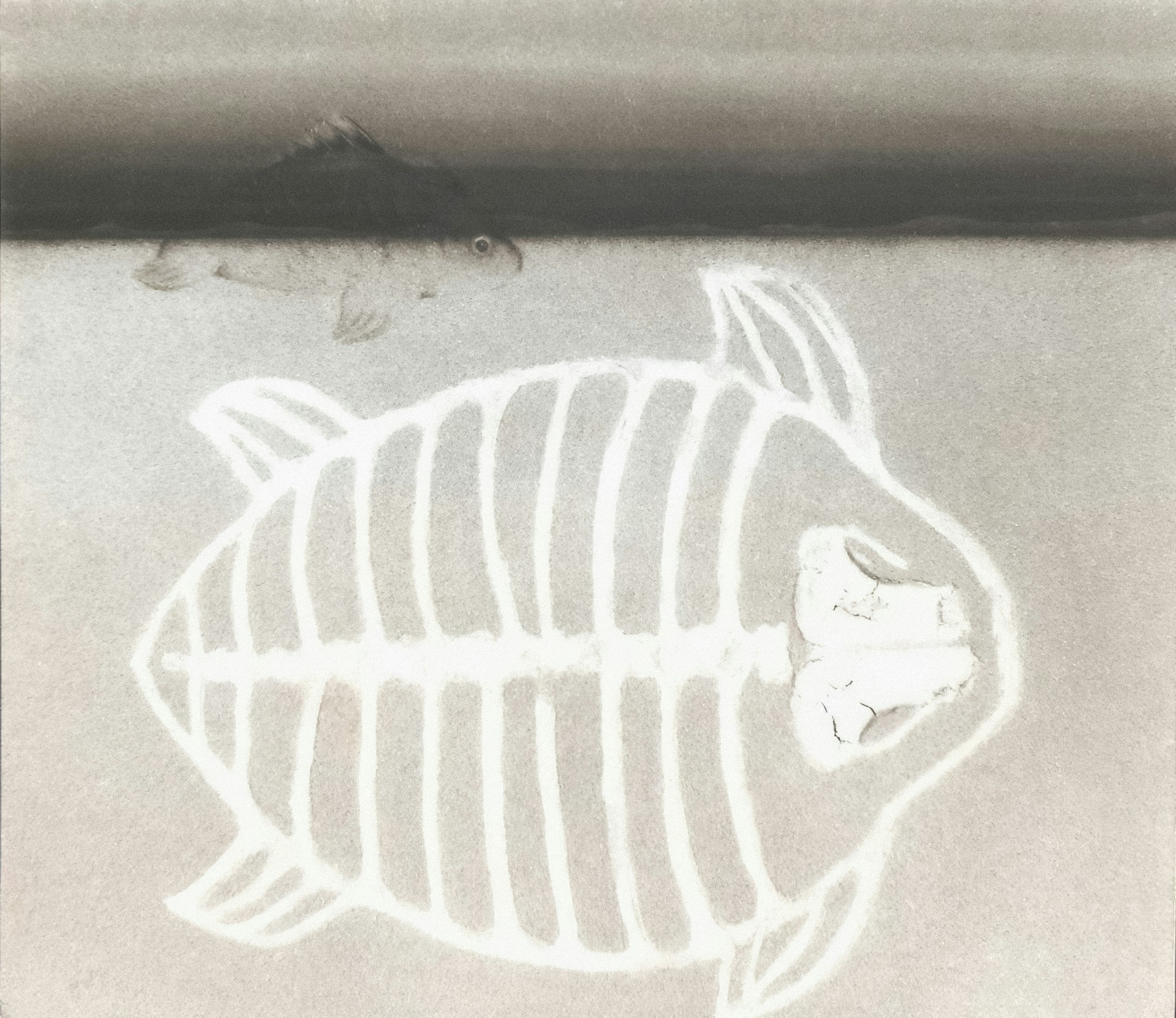 Fish skeleton floating beneath a living fish, evoking the fragile balance between life and extinction.